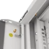 – Drzwi przednie: zdejmowane, z uziemieniem oraz z możliwością obustronnego montażu i obrotu do 180°, wyposażone w szybę hartowaną o grubości 5 mm oraz zamocowany zamek,